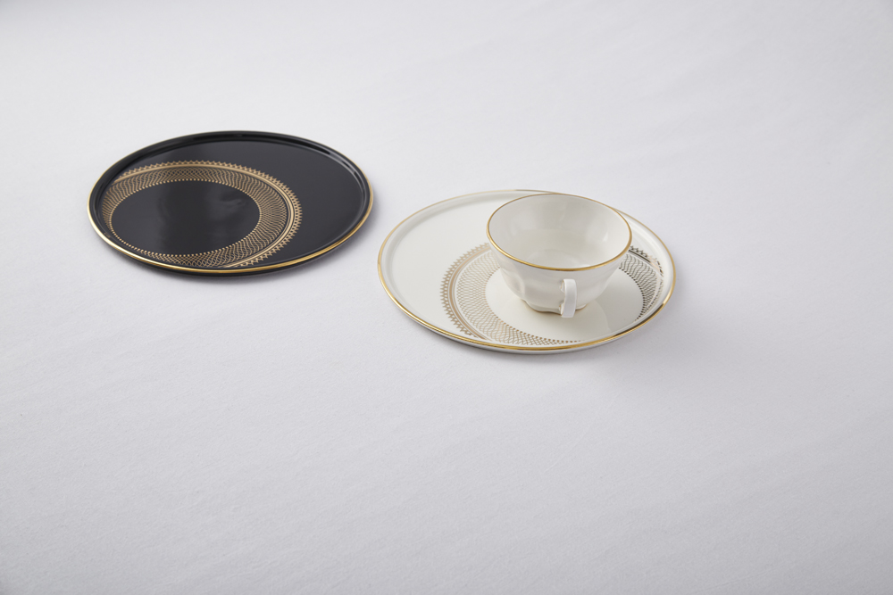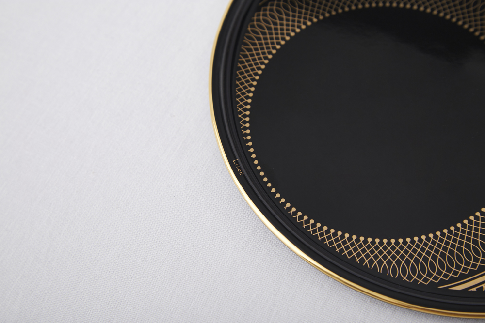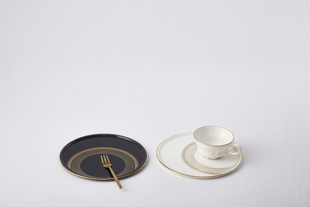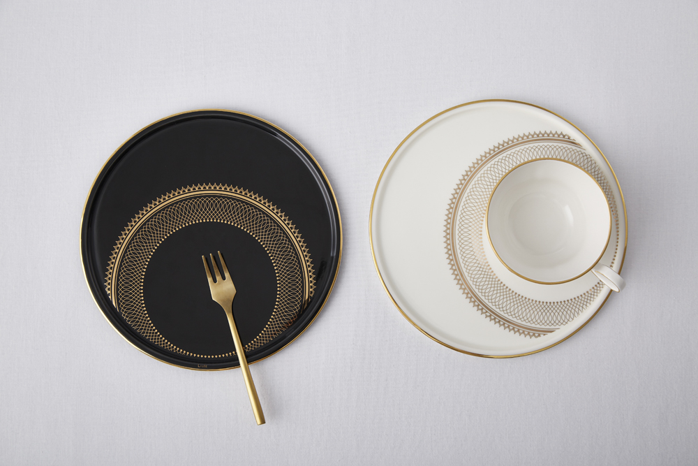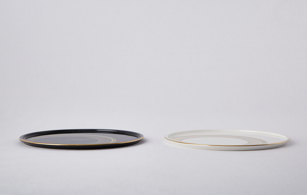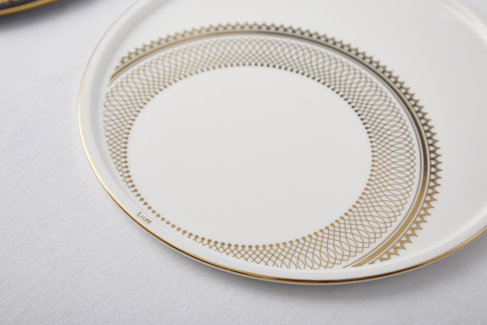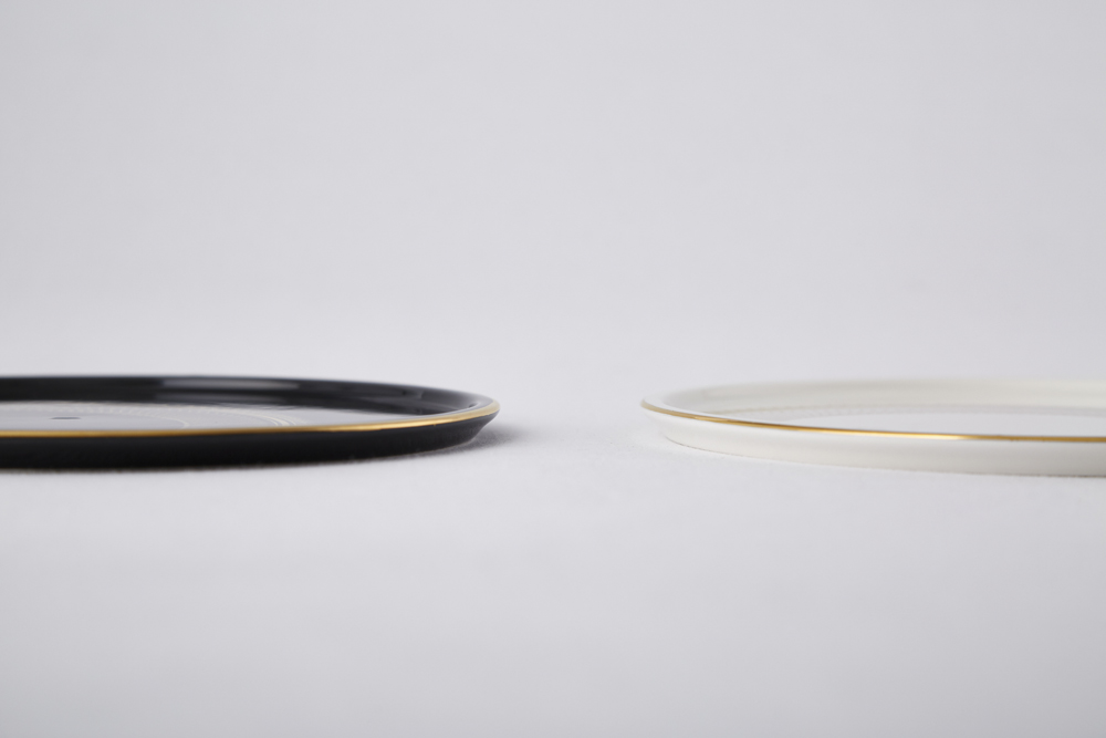 깔끔한 도자기의 색상 위로 빛나는 금 장식이 시선을 끕니다.