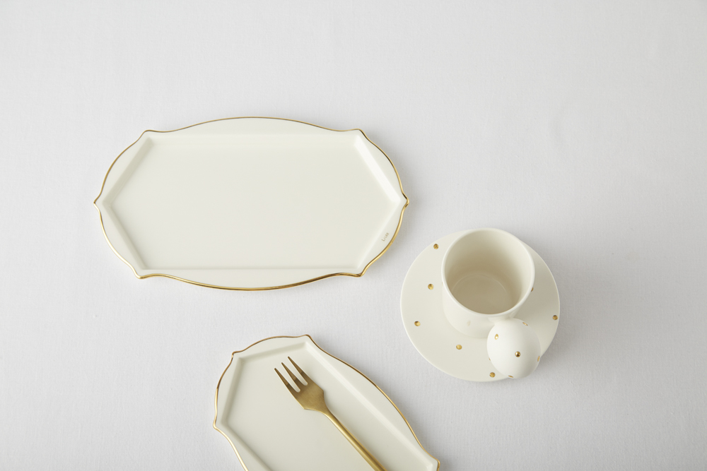 깔끔한 도자기의 색상 위로 빛나는 금 장식이 시선을 끕니다.