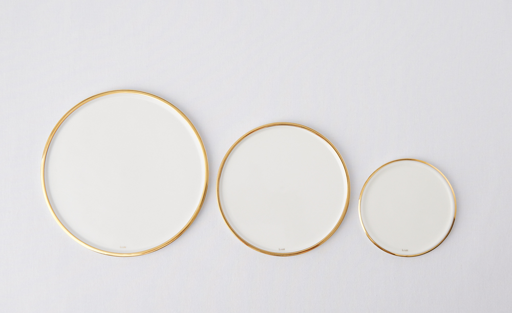 깔끔한 도자기의 색상 위로 빛나는 금 장식이 시선을 끕니다.