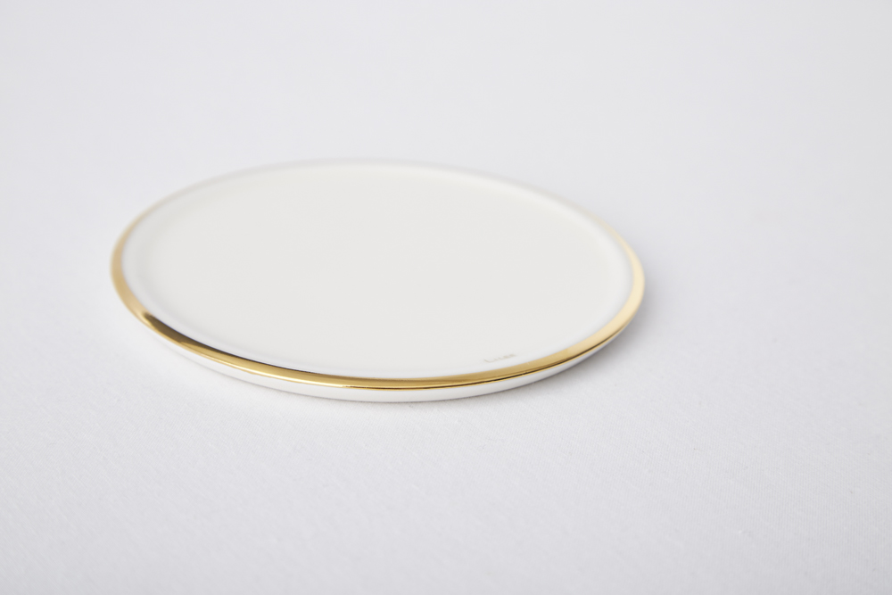 깔끔한 도자기의 색상 위로 빛나는 금 장식이 시선을 끕니다.