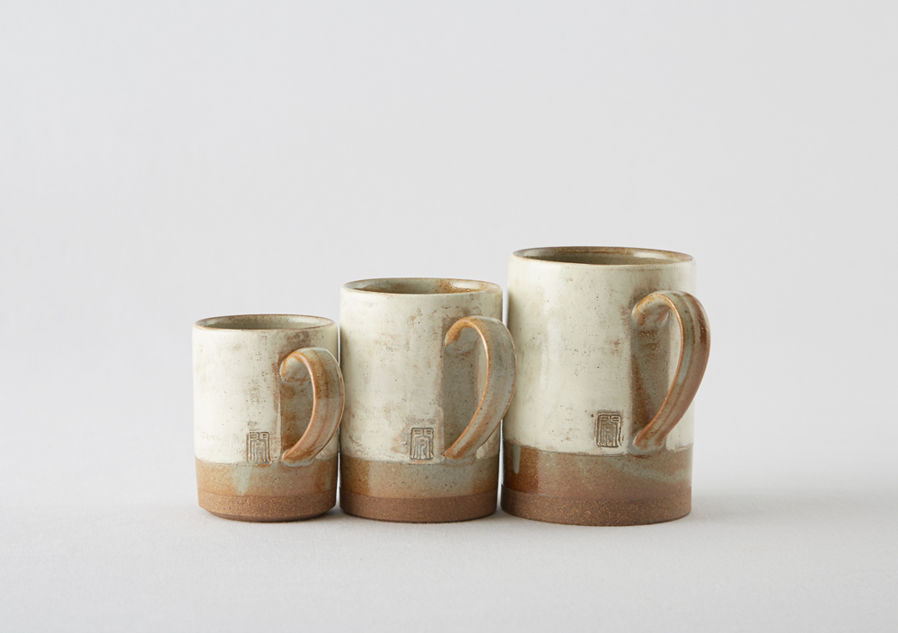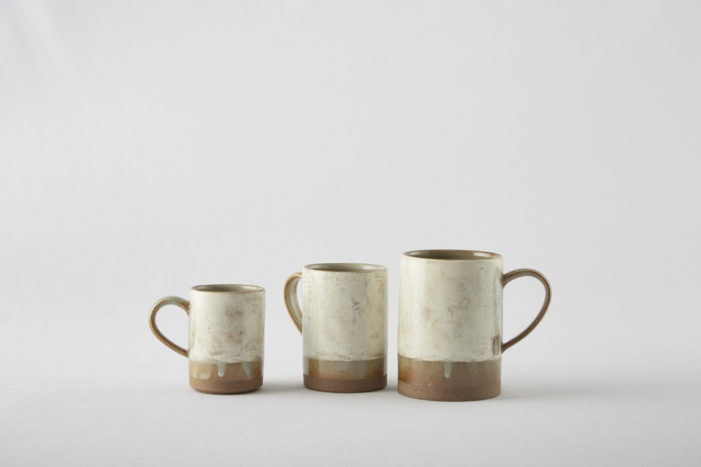 간결한 원통형의 머그를 흰 분청, 황색, 무광 갈색의 3가지 도자기 색으로 장식하였습니다.