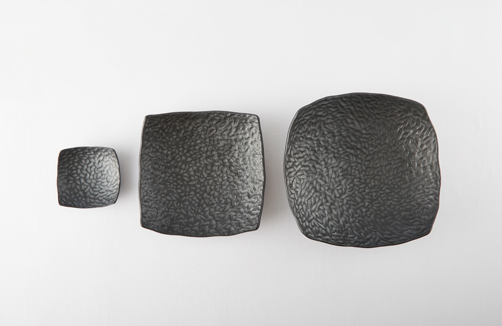 손맛이 느껴지는 비정형의 사각에 움푹옴푹 떠낸 입체감 있는 문양을 조각하였습니다.