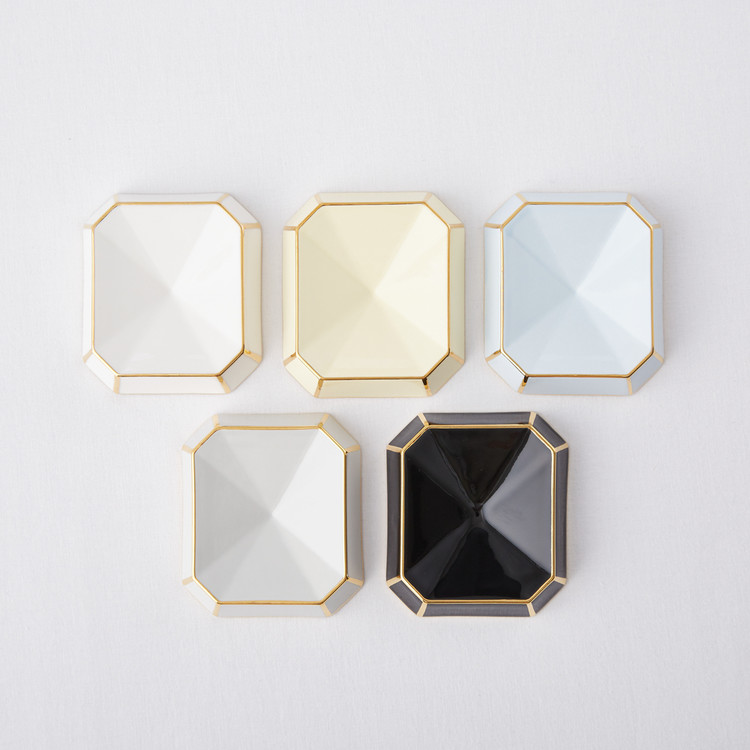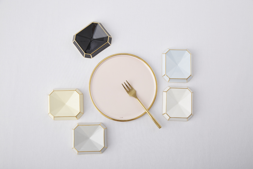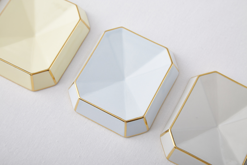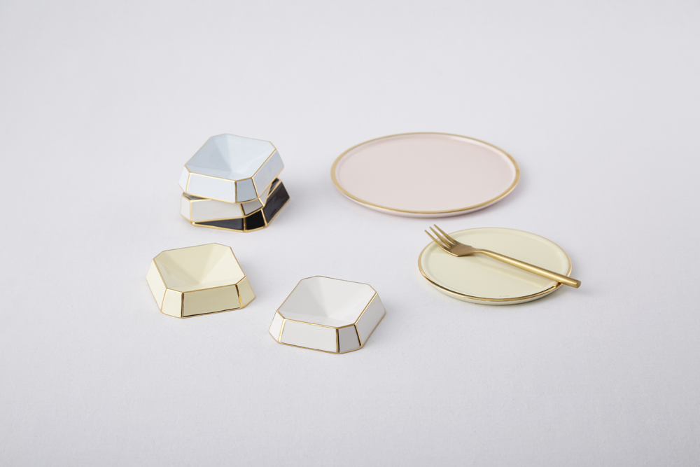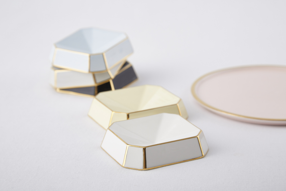 깔끔한 도자기의 색상 위로 빛나는 금 장식이 시선을 끕니다.