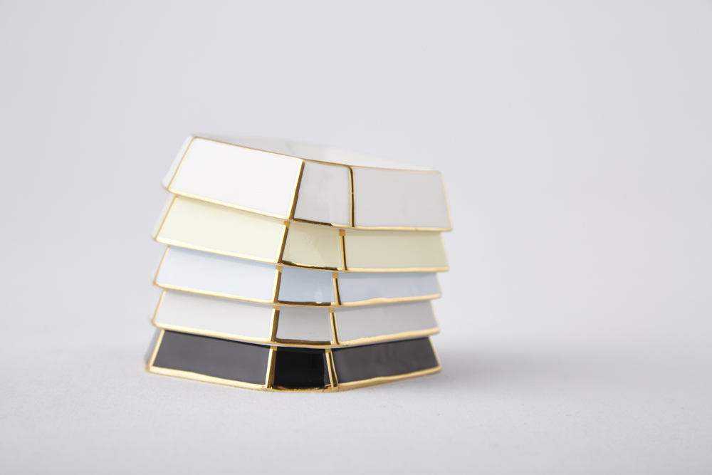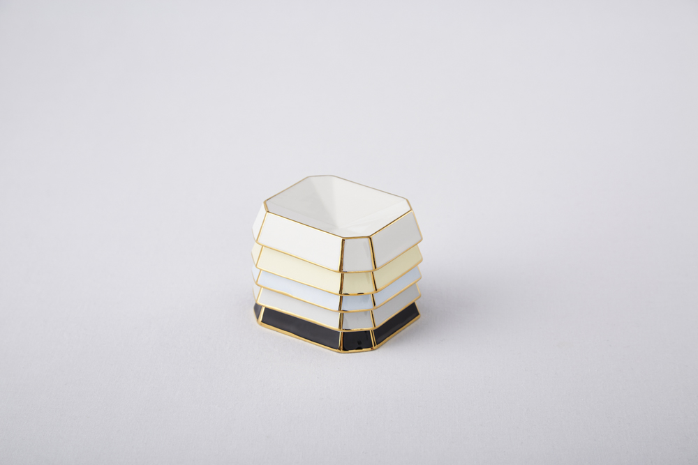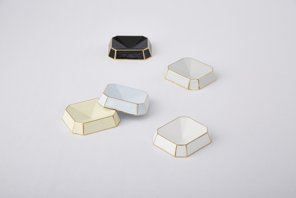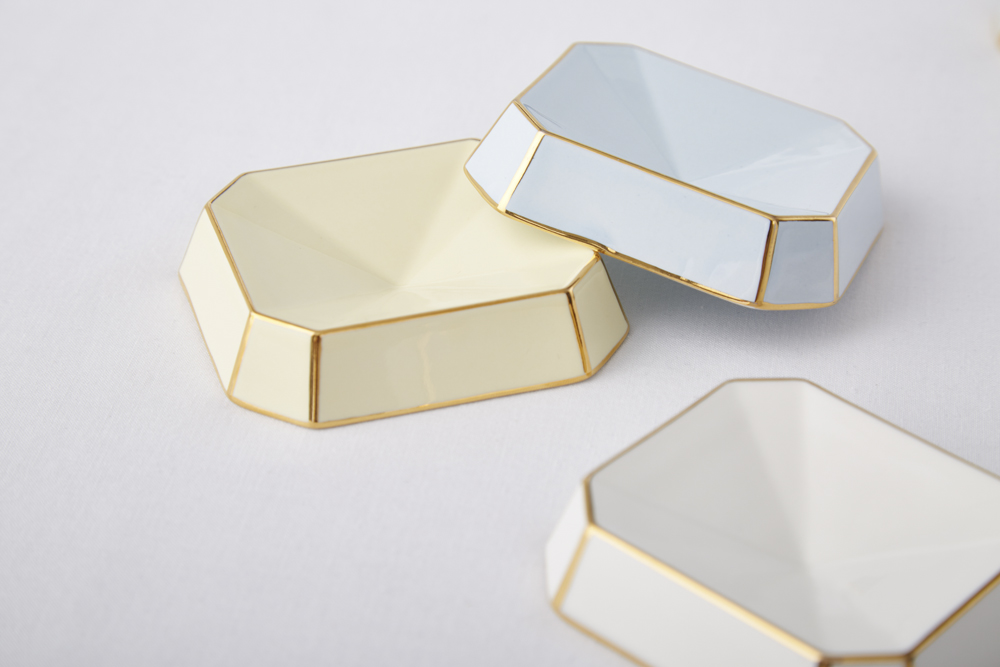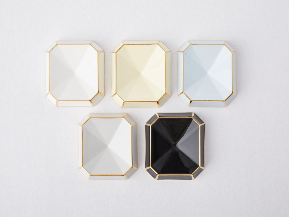 깔끔한 도자기의 색상 위로 빛나는 금 장식이 시선을 끕니다.