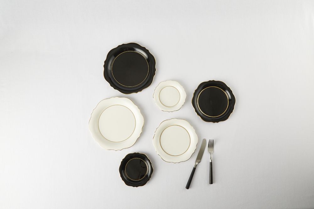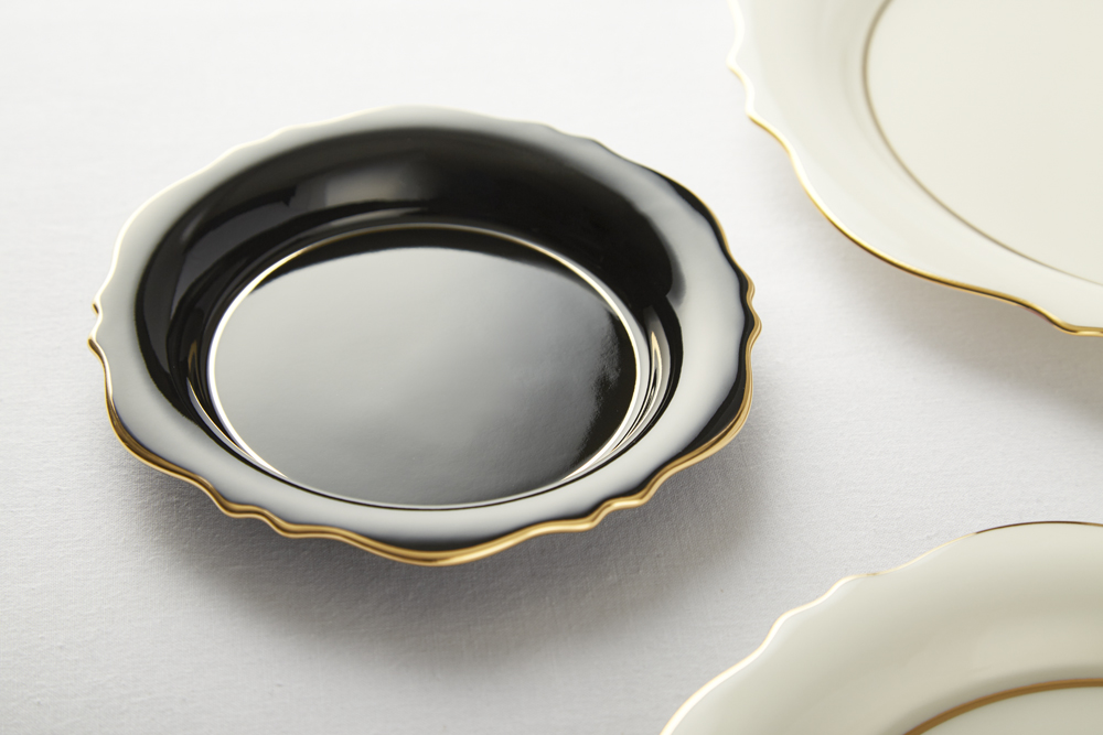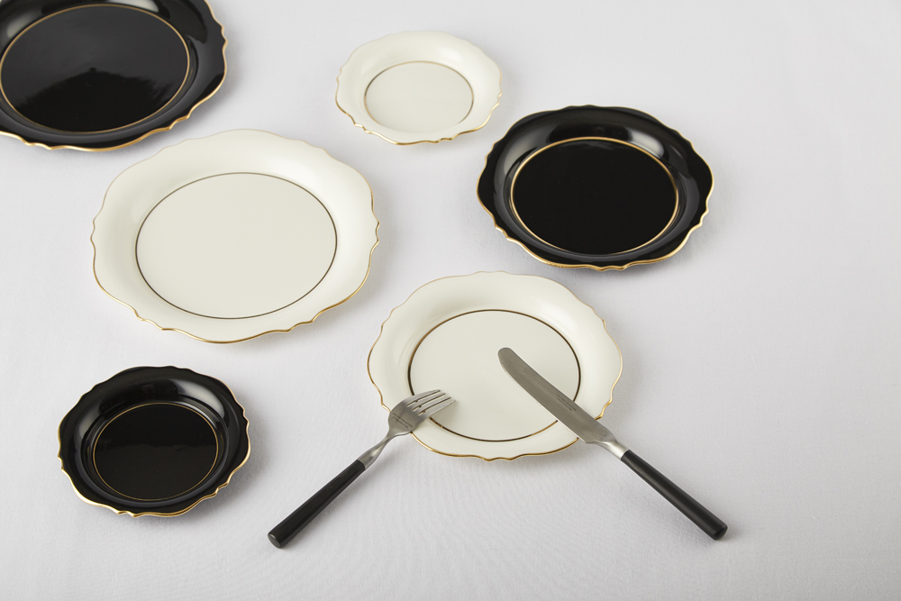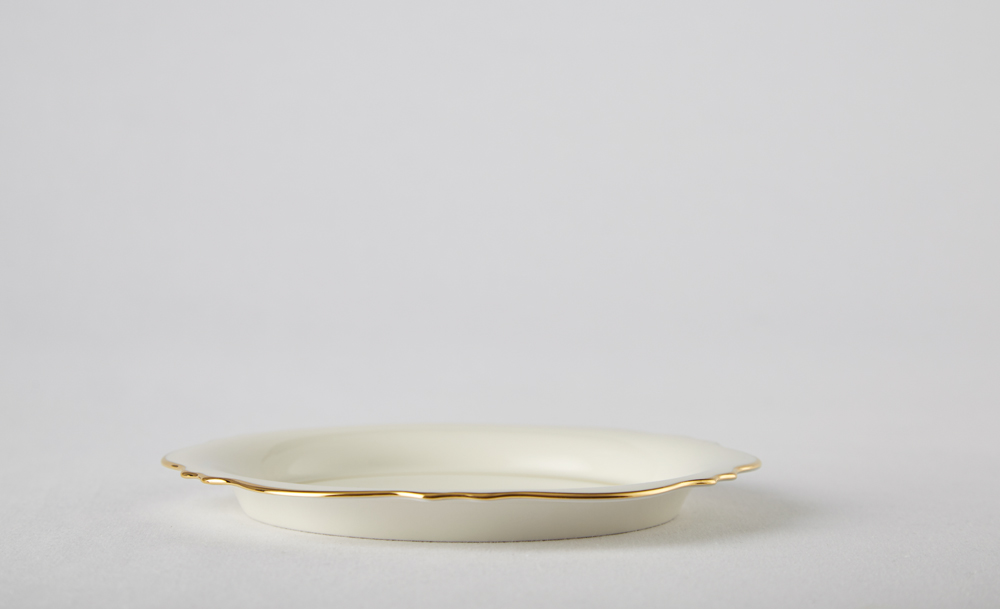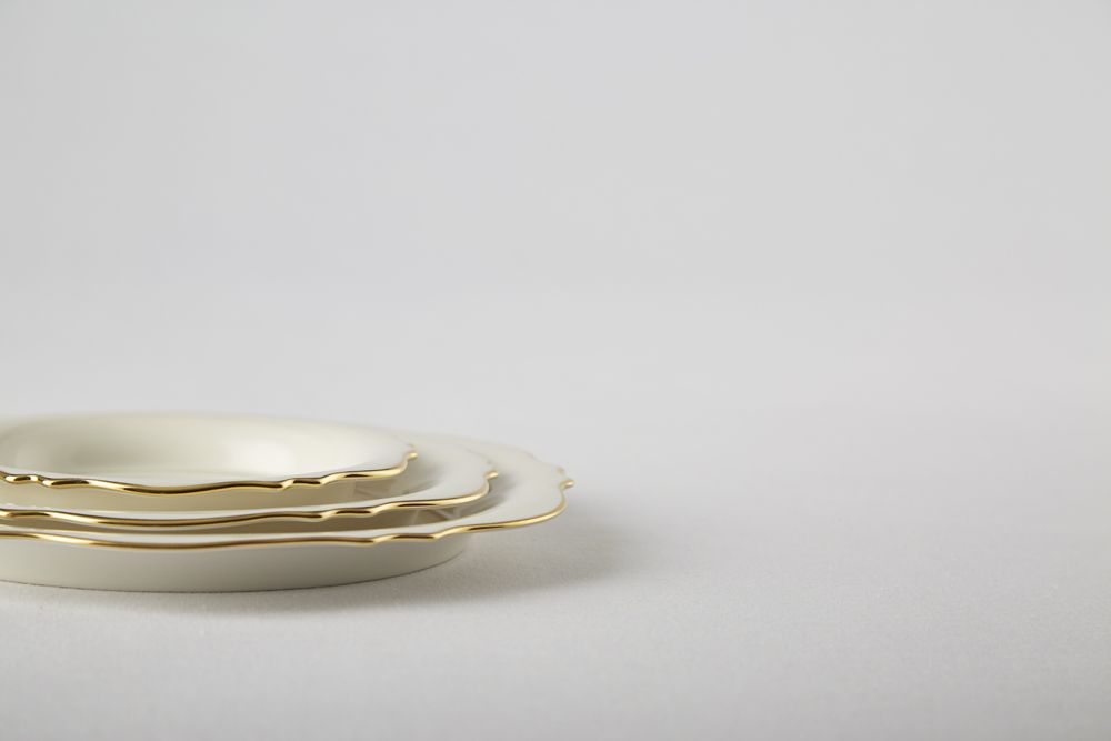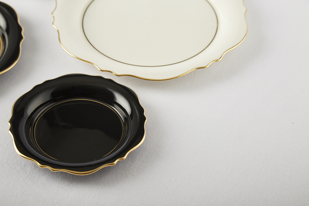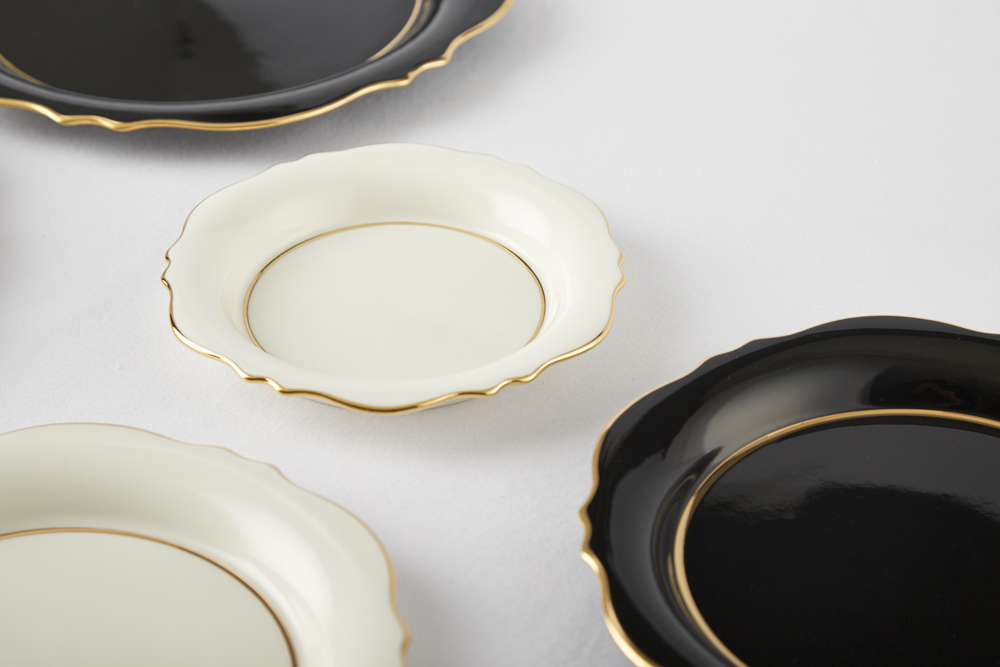 깔끔한 도자기의 색상 위로 빛나는 금 장식이 시선을 끕니다.