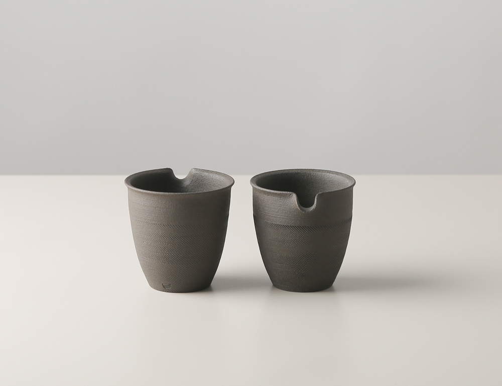 짙은 흑토의 질감과 부드러우면서 안정적인 형태, 면을 장식한 줄무늬 조각이 조화를 이룹니다.
